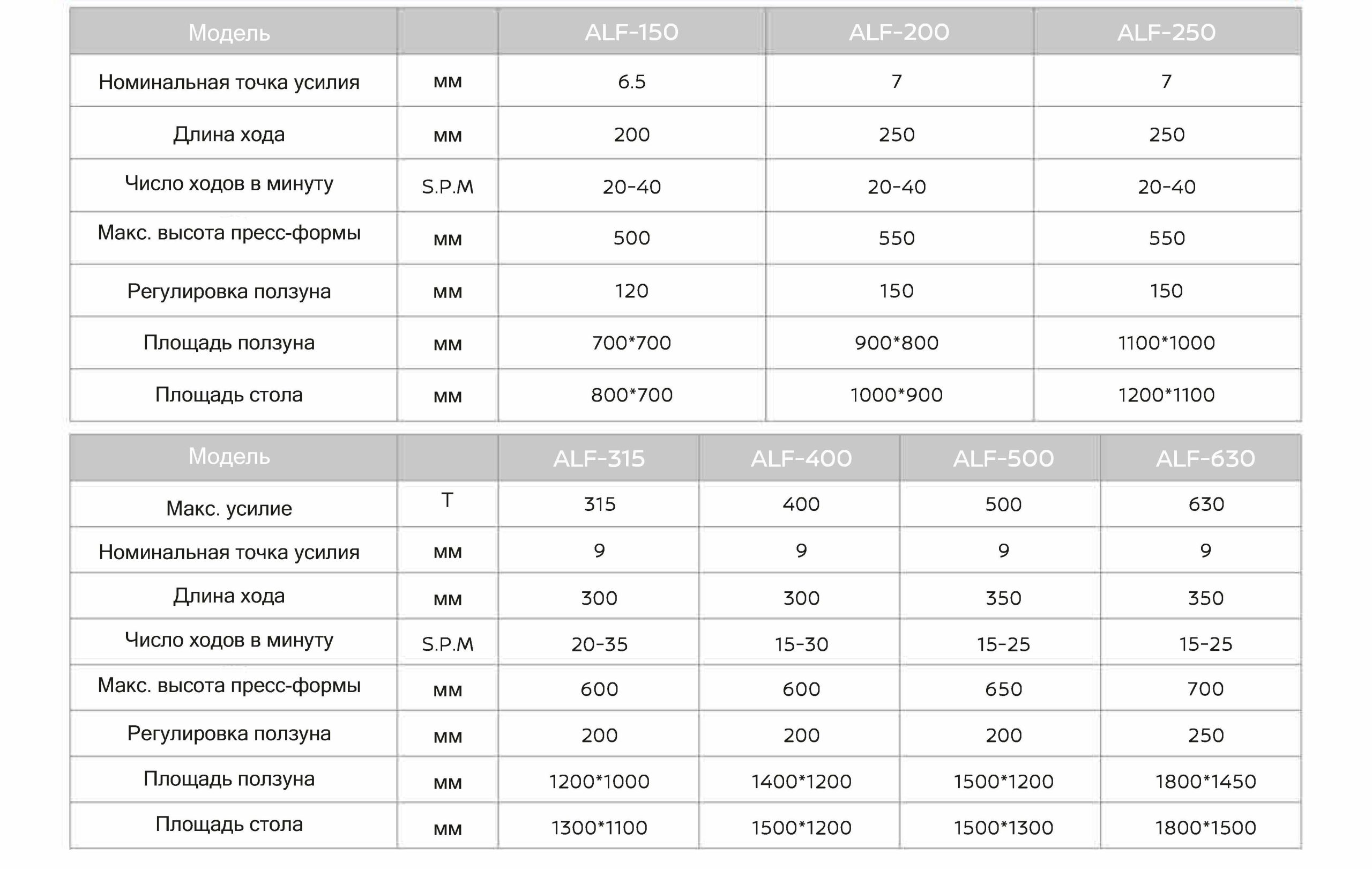 | Типоразмеры, номинальное усилие (т) | ALF-150 / 200 / 250 / 315 / 400 / 500 / 630 |